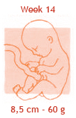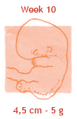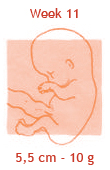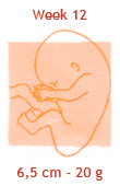 Vanaf nu is je kind compleet en zal het alleen nog maar groeien. Toch is het nog lang niet levensvatbaar. Het heeft nog maanden de tijd nodig om zich verder te ontwikkelen en de organen moeten rijpen om straks goed te kunnen werken. De baby voelt zich dus voorlopig opperbest in jouw buik. Als de organen eenmaal goed gevormd zijn, kan er niet veel meer fout gaan en dat is een geruststellende gedachte. De baby heeft nu een boven- en een onderkaak, waarin al twintig kleine knobbeltjes zitten die na de geboorte de melktandjes worden. En boven op het bolletje groeit het eerste haar! Hij houdt meestal de beentjes voor zich gevouwen en meet nu zo’n viereneenhalve centimeter. In deze week wordt meestal de baby opgemeten, met een echo via de buik, om de uitgerekende datum vast te stellen.