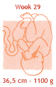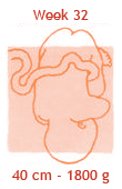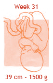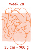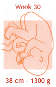 De nagels hebben nu bijna de topjes van de vingertjes bereikt. De nieren werken, de longetjes zijn vrijwel rijp… Kortom: de baby is bijna ‘klaar voor de start’. Hij komt nu ook nog maar een paar ons per week aan. Hoe groot het kindje precies is, is niet exact aan je buik te zien. In een kleine buik hoeft immers niet per se een kleine baby te zitten. En in een dikke buik niet zonder meer een grote baby. De grootte van je buik wordt naast het gewicht van de baby ook bepaald door de stevigheid van het spierweefsel, de hoeveelheid vruchtwater, de mate waarin je vocht en vet vasthoudt en je postuur. Iedereen in onze praktijk, die dit wil, krijgt van ons een echo bij 30-32 weken. Sommige zwangeren hebben een indicatie om vaker een echo te maken om zo de groei van de baby te vervolgen (deze worden dan betaald door de verzekering).