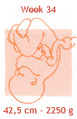 Als dit je eerste zwangerschap is, zal de baby rond deze tijd met het hoofdje dieper in het bekken zakken. Bij een tweede kind gebeurt dit meestal later, omdat de buikspieren al meer uitgerekt zijn en de baby nu nog ruimte heeft. De huid van de baby is nog steeds bedekt met huidsmeer, dat hem beschermt tegen infecties. Rond de vijfendertigste week laten de meeste stukjes huidsmeer los. De vlokjes drijven daarna rond in het vruchtwater. Aan het vruchtwater is ook te zien of de baby op het juiste moment geboren wordt. Is het vruchtwater kraakhelder zonder vlokjes, dan is hij te vroeg. Helder met vlokjes betekent op tijd en bij melkwit vruchtwater zijn de vlokjes helemaal opgelost en is de baby aan de late kant.