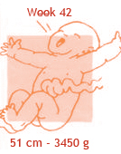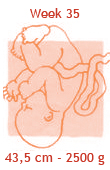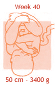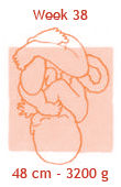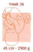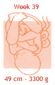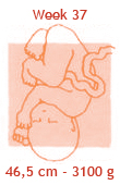 De baby krijgt nu twintig a dertig gram vet per dag. Daarmee bouwt hij alvast een reserve op voor de eerste dagen na de geboorte. Zo kan je kind rustig aan de borst of de fles wennen zonder al te hongerig te worden of te veel gewicht te verliezen. Het laagje vet onder de huid is nu zo dik, dat de baby straks zijn eigen lijfje goed op temperatuur kan houden. Er stroomt nu per minuut zo’n tien liter bloed langs de placenta, vol voedingsstoffen voor je baby. Mocht de baby deze week komen, dan mag je gewoon thuis bevallen.